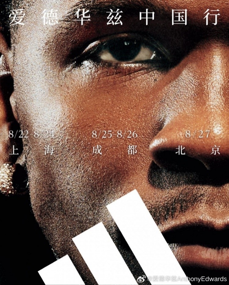 据悉,8月22日至27日,爱德华兹将先后造访上海、成都和北京三座城市,除了推广即将发布的阿迪达斯AE2签名鞋,爱德华兹还将参观长城、探访大熊猫。